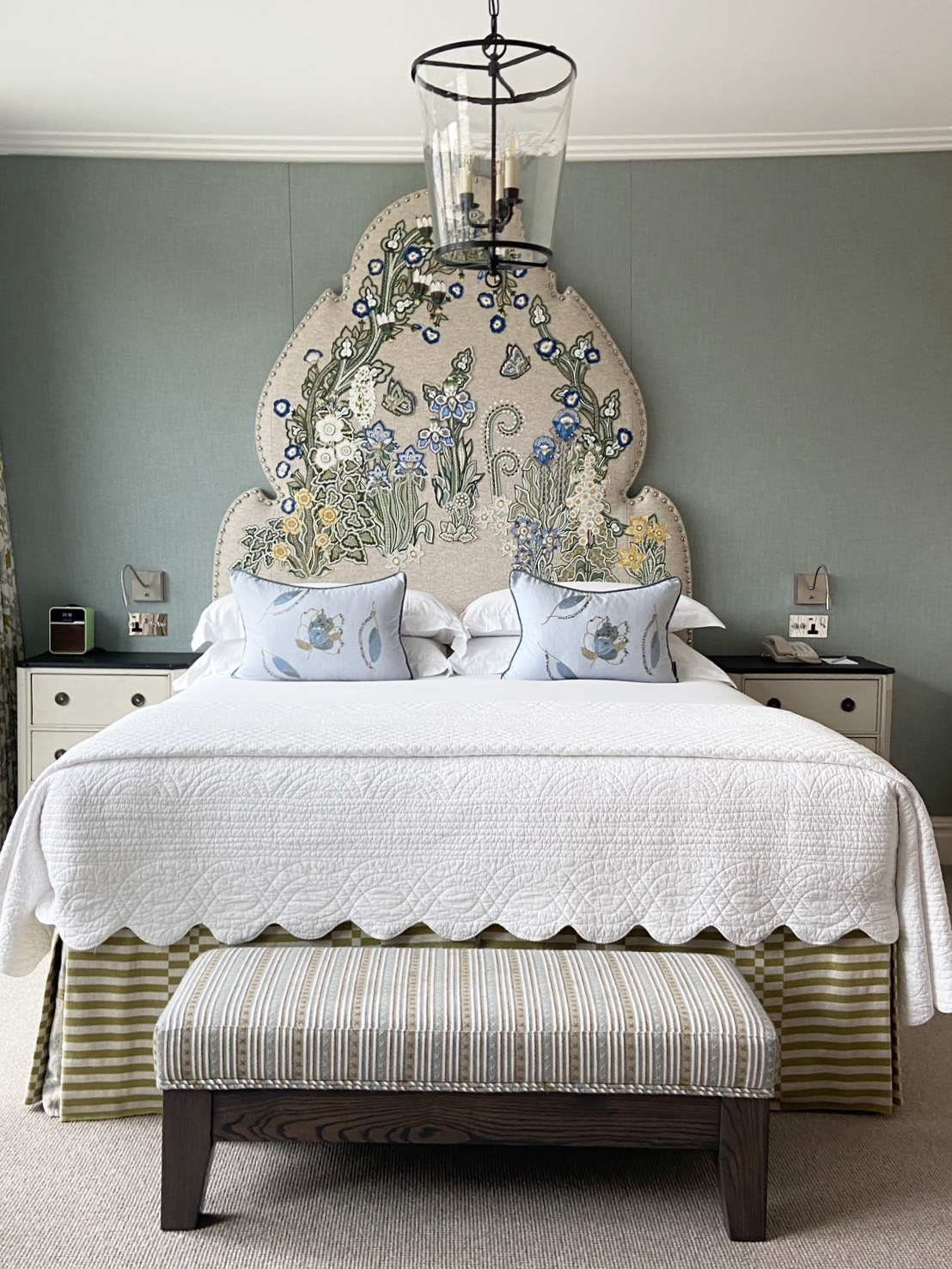 ベッドルームの美しいセッティング、ヘッドボードに施された見事な刺繍。