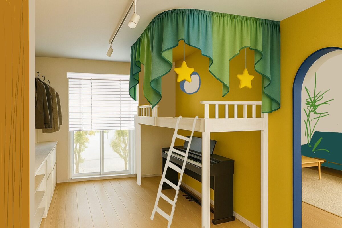 キッズエリアはファブリックの演出で楽しい空間にしたいものです。楽しい感じ、伝わりますか?パースがあるとイメージが広がりますよね!ところでこんな上飾りのカーテン、どうやって作るの?それはこれから業者さんと鬼のような打ち合わせが(笑)