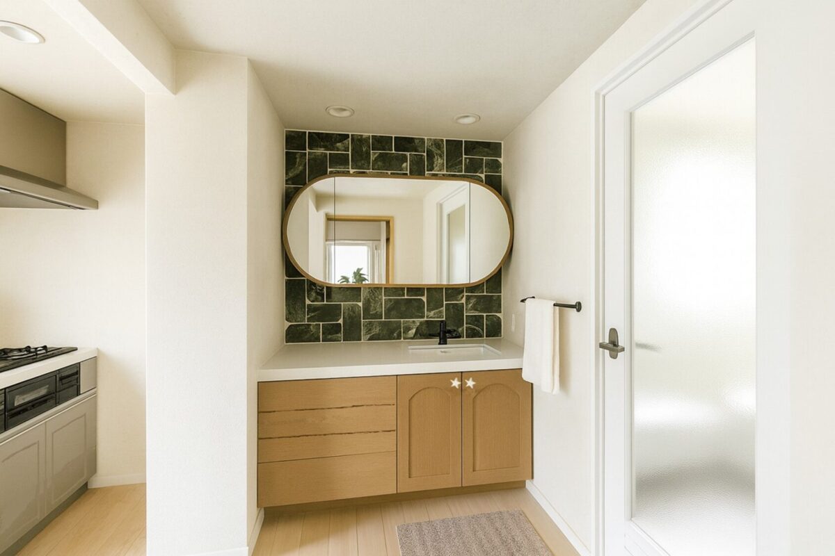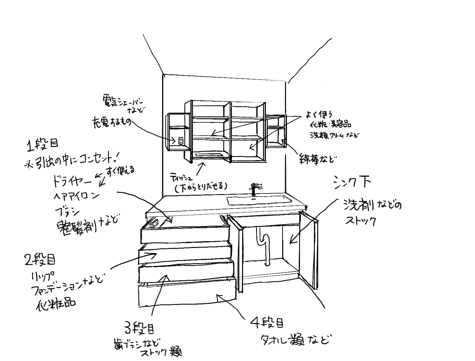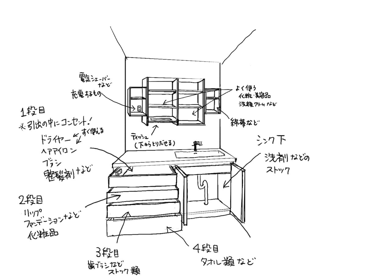 マンションリフォームの洗面台造作プランも、図面だけではなくてこうしたパースをご用意します。楕円形のカプセル型ミラーもかわいいでしょ!使い勝手のイメージは手描きのスケッチでこんなふうに。