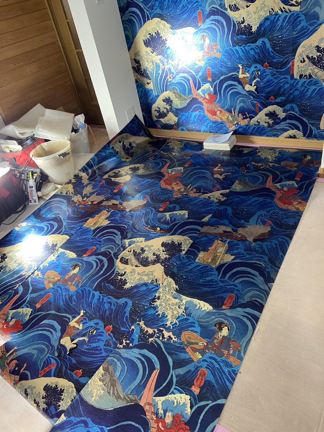 貼る前の壁紙を、いったん床に広げまして・・・どのくらいのウェーブをつけようかイメージトレーニングをして、指を動かす。