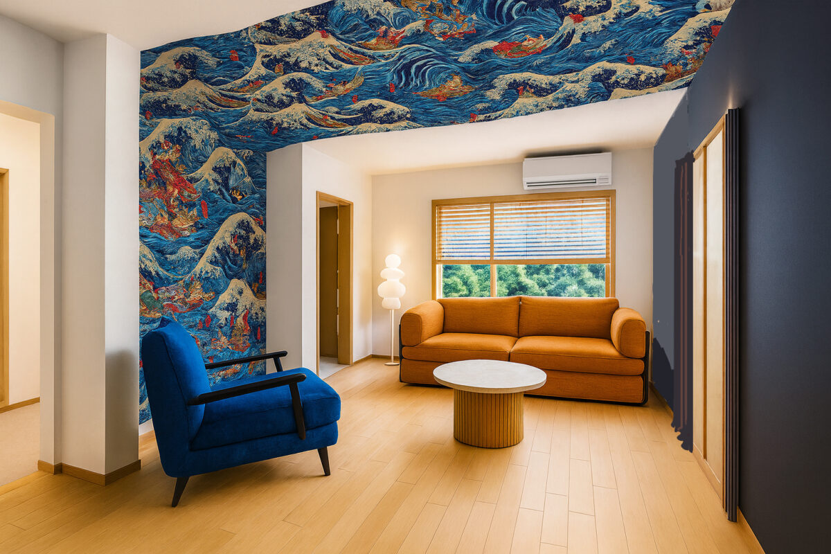 パースでご提案したのは、川の流れのように波打つ天井の壁紙!